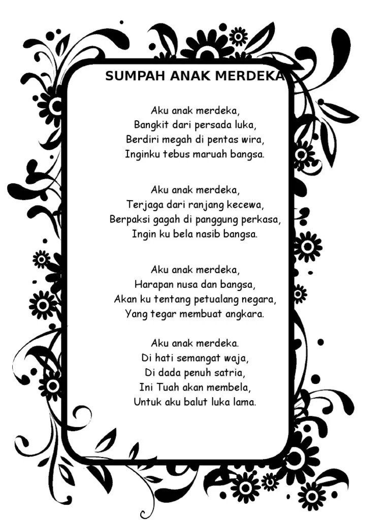 Sumpah anak merdeka aku anak merdeka bangkit dari persada luka berdiri megah di pentas wira inginku. Sumpah anak merdeka · bangkit dari persada luka. Inginku tebus maruah bangsa · terjaga dari ranjang kecewa. 10,695 views may 11, 2020 sajak sekolah ….more.more.